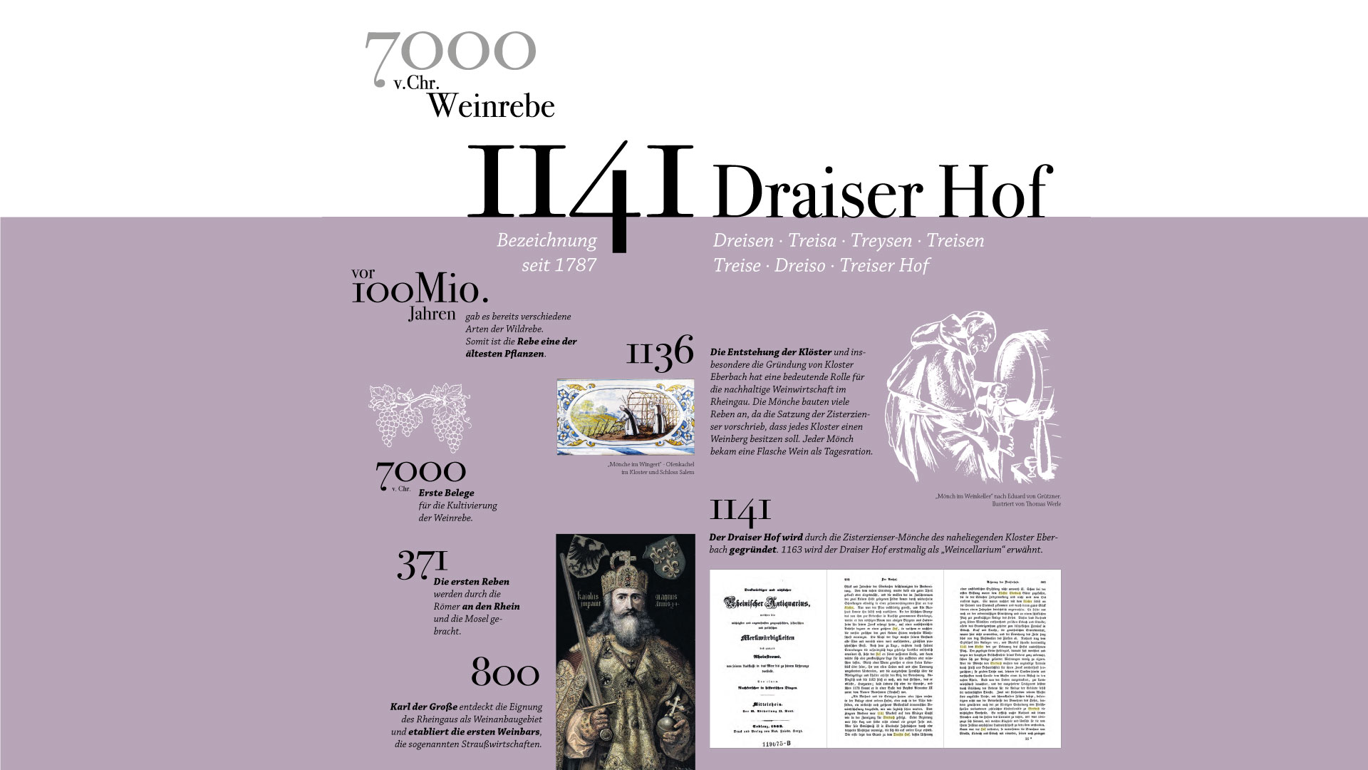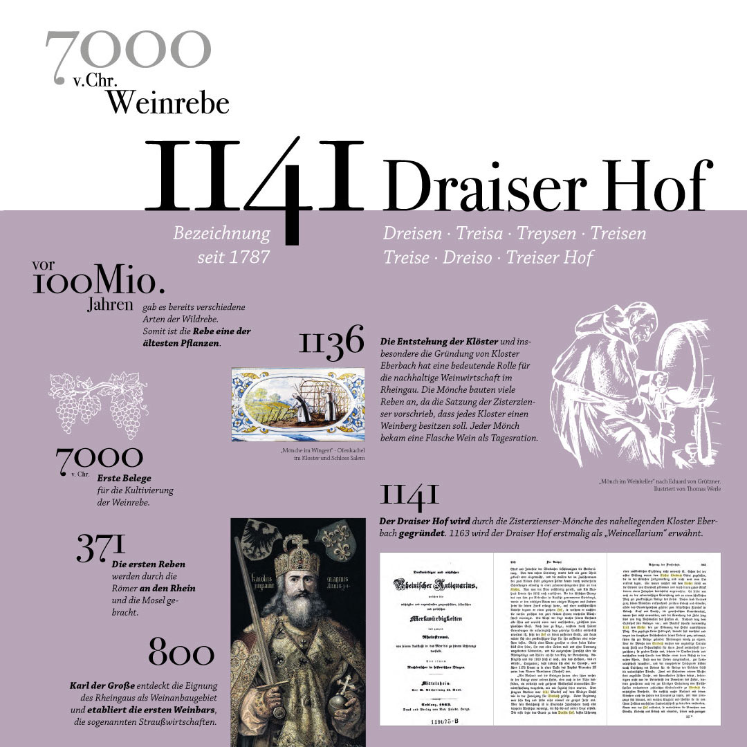 Mönche: Gründung des Draiser Hofes 1141 durch die Zisterzienser Mönche von Kloster Eberbach und 1163 Erwähnung als Wein-Cellarium